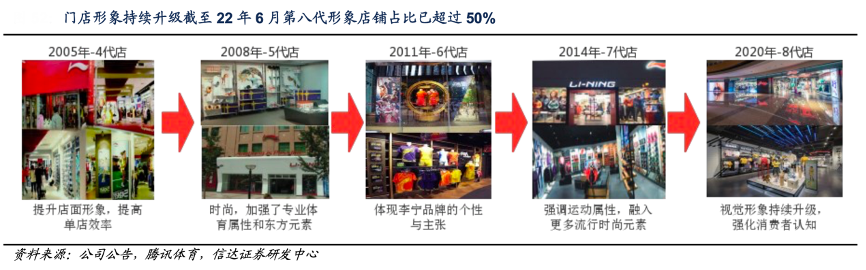 經(jīng)典案例:根據(jù)公司公告、騰訊體育、信達證券研發(fā)中心等綜合資訊表明,李寧公司持續(xù)優(yōu)化渠道建設布局,聚焦購物中心大店,推動旗艦店等高效大店落地,同時推進 店鋪結構優(yōu)化,加速處理虧損、低效門店。自 2020 年起,公司積極推進門店視覺形象的升級,加速第八代形象店建設,截至 22 年 6 月第八代形象店鋪占比已超過50%。