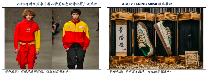 經(jīng)典案例:根據(jù)前瞻產(chǎn)業(yè)研究院、李寧官方微博、信達證券研發(fā)中心等綜合資訊表明,李寧公司以接近設計師品牌的運作模式,重視原創(chuàng)設計理念,2018 年憑借“番茄炒蛋色”的獨特設計,打破國內(nèi)運動服飾的刻板印象,成為新國潮的象征。22 年初公司與 ACU 合作推出的 ACU x LI-NING 50/50 聯(lián)名鞋款融入中醫(yī)文化元素,以中醫(yī)中所用的中藥材作為其主要設計理念,將中國傳統(tǒng)文化與西方街頭潮流運動文化相結合,以創(chuàng)新的理念詮釋國潮風。