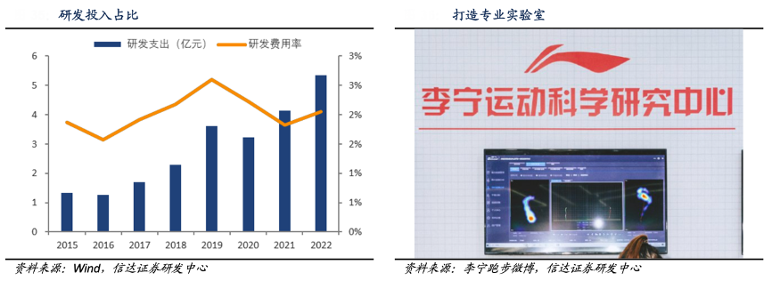經(jīng)典案例:根據(jù)wind、李寧跑步微博、信達(dá)證券研發(fā)中心等綜合資訊表明,近年來李寧公司研發(fā)支出持續(xù)增長(zhǎng),2022 年公司研發(fā)費(fèi)用為 5.34 元,同增 28.99%,研發(fā)費(fèi)用增幅超過營(yíng)收。公司重視運(yùn)動(dòng)科 學(xué)領(lǐng)域研究,2008 年創(chuàng)立李寧運(yùn)動(dòng)科學(xué)研究中心,配備科研級(jí)別實(shí)驗(yàn)設(shè)備,下設(shè)運(yùn)動(dòng)生物力學(xué)、鞋機(jī)械測(cè)試以及腳型實(shí)驗(yàn)室,為產(chǎn)品研發(fā)提供技術(shù)保障和科學(xué)依據(jù)。依托于對(duì)產(chǎn)品科技的持續(xù)投入,公司擁有多項(xiàng)鞋履核心技術(shù),相繼開發(fā)出“李寧云”、“李寧弜”、 “Light Foam”和“李寧?”等多種中底材料和科技,提升運(yùn)動(dòng)鞋緩震、回彈、輕量性。