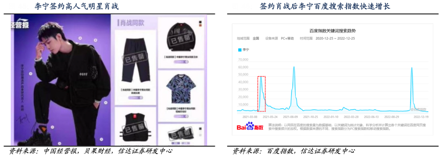 經(jīng)典案例:根據(jù)中國(guó)經(jīng)營(yíng)報(bào)、貝果財(cái)經(jīng)、百度指數(shù)、信達(dá)證券研發(fā)中心等綜合資訊表明,李寧公司與娛樂圈聯(lián)動(dòng),持續(xù)簽約優(yōu)質(zhì)明星,挖掘潛在年輕消費(fèi)群體。2021 年公司簽約高人氣明星肖戰(zhàn),提高國(guó)民認(rèn)可度,在官宣肖戰(zhàn)成為李寧運(yùn)動(dòng)潮流產(chǎn)品全球代言人的當(dāng)晚,宣傳海報(bào)中肖戰(zhàn)同款鞋服配飾全部售罄。李寧簽約肖戰(zhàn)當(dāng)天,“李寧”的百度搜索指數(shù)達(dá)到當(dāng)年最高的 115499,是當(dāng)年日均值 9285 的 12.4 倍;2021 年上半年的日均值 為 9127,相比于 2020 下半年的 4479 增長(zhǎng) 103.77%。