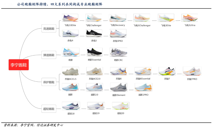 經典案例:根據李寧官網、信達證券研發中心等綜合資訊表明,李寧公司聚焦專業跑鞋的技術研發和性能優化,持續擴充專業跑鞋矩陣,并進行產品迭代。大眾休閑方面,公司李寧嵐、云雀覆蓋業余跑者慢跑等日常運動需求;專業跑步方面,公司六大跑鞋家族(飛電、絕影、赤兔、超輕、烈駿、越影)可以覆蓋競速、競訓、緩震保護、超輕支撐運動場景,矩陣覆蓋群體從初級到專業跑者,助力消費者提升運動表現。