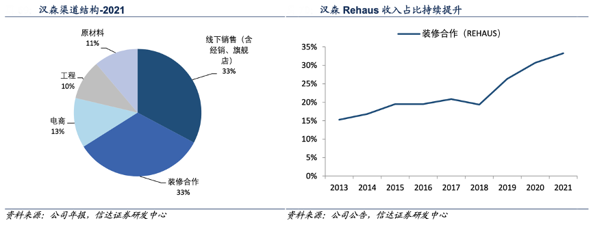 經典案例:根據公司年報、公司公告、信達證券研發中心等綜合資訊表明,漢森成立于 1970 年,櫥柜起家,而后陸續拓展衣柜、室內軟體家具以及家居小件等品類,其中櫥衣木質家具由漢森自產,其他家具品類以 OEM 或者和其他家具品牌合作銷售為主,通過客廳空間、臥室空間等多空間的展示以實現整體家居產品的銷售。2016年將 IK 部門升級為 Rehaus 整裝店,推出整裝產品套餐、加速整合裝修公司。2016 年以后,在韓國市場的地產周期下行的 背景下,Rehaus 仍實現逆勢增長,