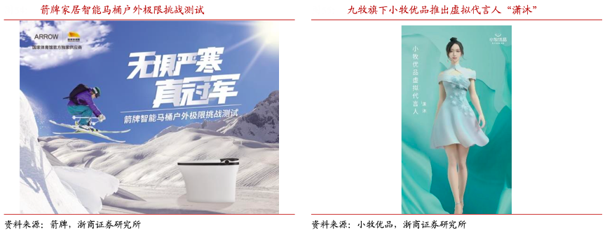 經典案例:根據箭牌、小牧優品、浙商證券研究所等綜合資訊表明,九牧推出“浴見智惠理想型”活動,將智能馬桶 ZS760 擬人化推出視頻短片,植入產品賣點;小牧優品發布年輕多彩戰略、推出國風虛擬偶像“瀟沐”。