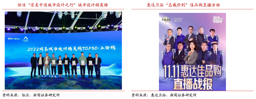 經典案例:根據恒潔、惠達衛浴、浙商證券研究所等綜合資訊表明,恒潔衛浴推出綜藝直播“這空間很中國”,聯合 KOL 探討中國式理想空間,聯手網易舉辦“質美中國城市設計之行”活動;惠達衛浴舉辦“總 裁價到”佳品購抖音直播活動。同時惠達衛浴鄭州開業 7.0 智能定制體驗店,聚齊全品類產品;箭牌開設合肥體驗中心,營造“細分化”、“數字化”、“智能化”家居場景,給消費者一站式體驗+智能家居消費教育。