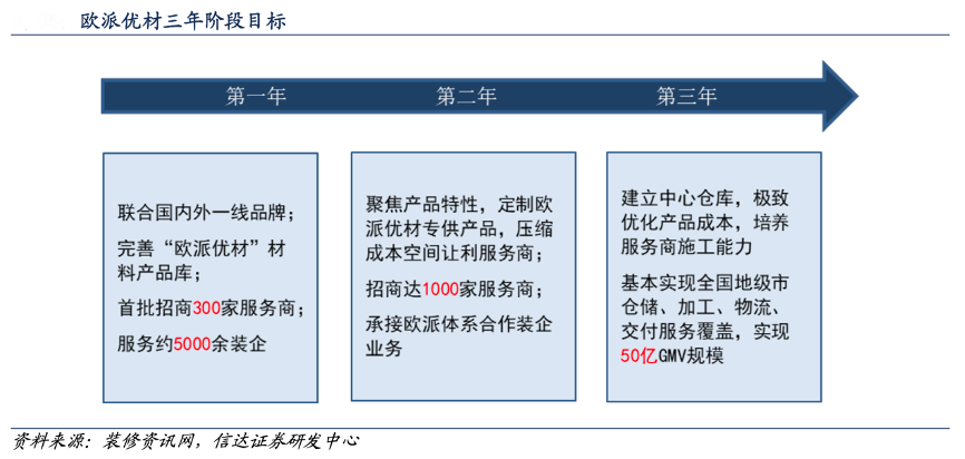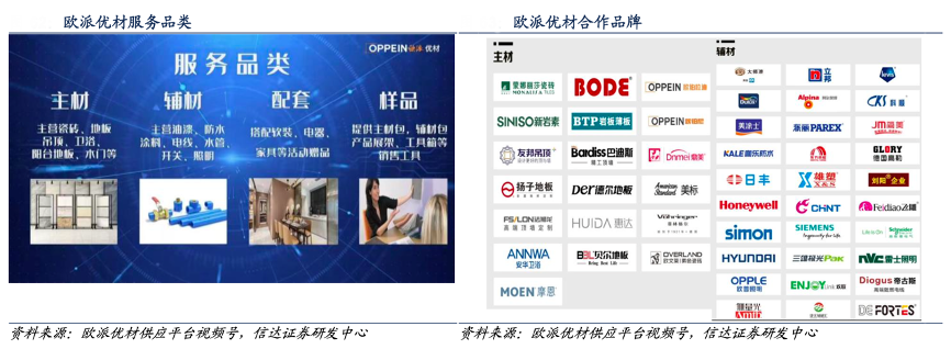 經(jīng)典案例:根據(jù)歐派優(yōu)材供應平臺視頻號、信達證券研發(fā)中心等綜合資訊表明,2021年7月,歐派優(yōu)材公司推出一站式主輔材供應平臺“歐派優(yōu)材”,以輕資產(chǎn)模式運行,核心戰(zhàn)略是為了讓消費者材料選擇簡單化、材料商經(jīng)營便捷化、裝企協(xié)同交付輕松化,合作品牌包括東方雨虹、霍尼韋爾、西門子、三棵樹、雷士照明、巴迪斯、友邦、多樂士、施耐德、德高等頭部裝修材料品牌。