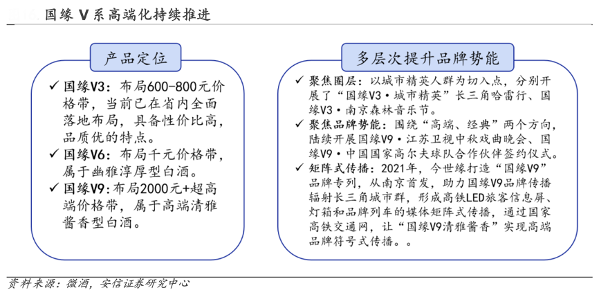 經典案例:根據微酒、安信證券研究中心等綜合資訊表明,今世緣公司在高端市場國緣 V 系布局清晰:其中V3、 V6 為幽雅醇厚型白酒,V9 為清雅醬香型白酒,V 系列定位超高端,V3 卡位 600 元+,V6 卡 位千元之上,V9 定價 2000 元以上,定位超高端,公司采取“V9 做形象、V3 做銷量、V6 做補充”的差異化布局。