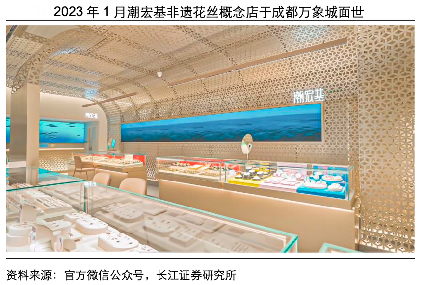 經(jīng)典案例:根據(jù)官方微信公眾號(hào)、長(zhǎng)江證券研究所等綜合資訊表明,2023 年 1 月,潮宏基首家非遺花絲概念店在成都萬象城面世,全店裝修風(fēng)格與花絲工藝呼應(yīng),東方文化底蘊(yùn)得以具象化、可視化,品牌效應(yīng)凸顯。