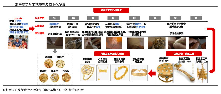 經(jīng)典案例:根據(jù)臻寶博物館公眾號(hào)、長(zhǎng)江證券研究所等綜合資訊表明,潮宏基多年持續(xù)深耕花絲工藝,2009年在北京設(shè)立花絲鑲嵌工藝設(shè)計(jì)實(shí)驗(yàn)室,通過仿制故宮文物不斷磨練技術(shù)水平,同時(shí)從歷年獲獎(jiǎng)產(chǎn)品來看,潮宏基不斷嘗試將東方審美元素融入原創(chuàng)設(shè)計(jì),其較強(qiáng)的設(shè)計(jì)能力或能在佩飾性需求逐漸多元化的情境下綻放異彩。