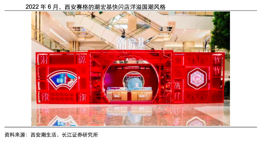經(jīng)典案例:根據(jù)西安潮生活、長(zhǎng)江證券研究所等綜合資訊表明,2022年6月,西安賽格的潮宏基快閃店洋溢著國(guó)潮風(fēng)格。