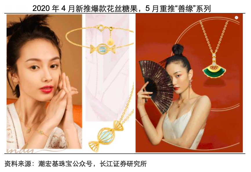 經典案例:根據潮宏寶珠寶公眾號、長江證券研究所等綜合資訊表明,2020 年 4 月潮宏基聯合世界知名日本設計師佐藤大共同設計推出的花絲糖果系列,在 佳琦直播間創下“上架 1 分鐘,8000 件秒空”的銷售佳績3,成為首款應用非遺花絲工藝的爆品;2020 年 5 月潮宏基重新推出 2015 年的核心產品“善緣”系列,并發布當年的彩金潮流趨勢主題“金彩回潮”,開啟國潮系列產品的快速推新。