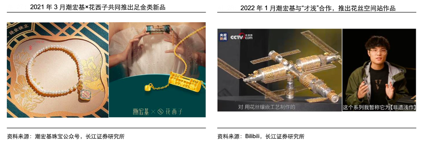 經典案例:根據潮宏基珠寶公眾號、Bilibili、長江證券研究所等綜合資訊表明,2021 年 3 月,潮宏基聯合以中國傳統美學元素為核心的國貨美妝品牌花西子,共同推出并蒂同心足金手鏈、心之鎖向足金墜鏈等新品;2022 年1 月,潮宏基聯合 Bilibili 上擁有 484 萬粉絲的手工界頂流 UP 主“才疏學淺的才淺”,利用花絲工藝打造了中國空間站模型,創作視頻播放量達到 504 萬,投幣量高達 110 萬,成為 B 站上少見的“幣比贊多”的視頻作品(意味著觀眾看完視頻甚至產生了“付費”意愿,體現強烈的認可和贊賞)。