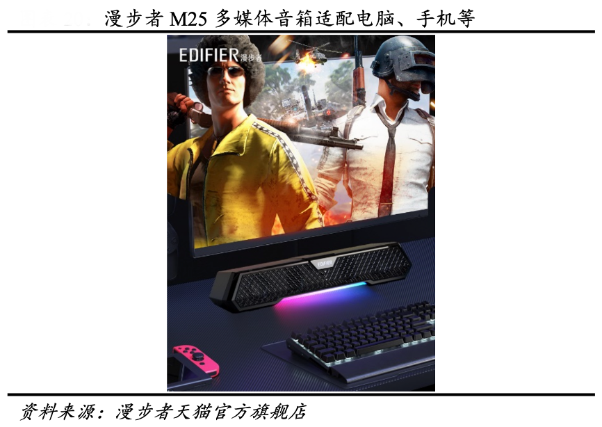 經典案例:根據漫步者天貓官方旗艦店、方正證券研究所等綜合資訊表明,漫步者多屏協同,改良升級多媒體音箱,優化連接、語音等方面。2022 年 11 月,公司發布 M25 多媒體音箱,配置功能適合電腦、手機等設備的連接和播放。