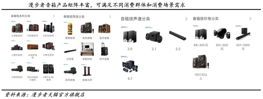 經典案例:根據漫步者天貓官方旗艦店、方正證券研究所等綜合資訊表明,漫步者聚焦音箱產品矩陣豐富,充分滿足不同消費群體和消費場景需求。其居家場景主要聚焦于音箱品類,1)用途方面:公司音箱產品囊括 便攜、藍牙、居家、家庭影院、拉桿音箱等多個品類;2)產品系列: 包含 S 頂級、R 經典、E 時尚等多個系列;3)價格方面:公司價格段 覆蓋廣泛,從 100 元以下至 1000 元以上均有所布局。