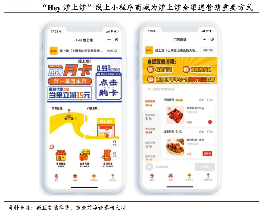 經典案例:根據微盟智慧零售、東亞前海證券研究所等綜合資訊表明,煌上煌轉戰線上及互聯網平臺,積極布局新零售,進行全渠道營銷。其中包括:1) 搭建“Hey 煌上煌”線上小程序商城,引流線下門店并添加顧客至微信群,后續通過優惠券推送提高復購率,2022年7月,小程序商城月度 GMV 突破 1000 萬元。2) 重構內容營銷矩陣,聚焦“兩微一抖”等平臺,實現加盟商門店一店一播,同時通過微信公眾號、抖音等渠道進行宣傳及福利種草,進一步實現消費轉化。