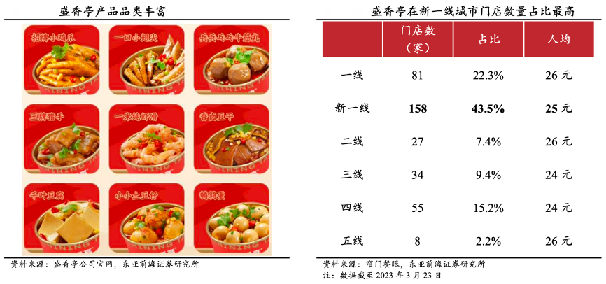 經典案例:根據盛香亭公司官網、窄門餐眼、東亞前海證券研究所等綜合資訊表明,盛香亭于 2016 年 4 月成立,以“老味道,新創造”的主張,通過新食材、新工藝、新吃法來顛覆傳統鹵味產品,屬于新式熱鹵范疇。截至2023 年 3 月 23 日,盛香亭在全國擁有 363 家門店,分布于 14 個省份與 60 座城 市,其中以長沙市為代表的新一線城市門店數量占比最多。