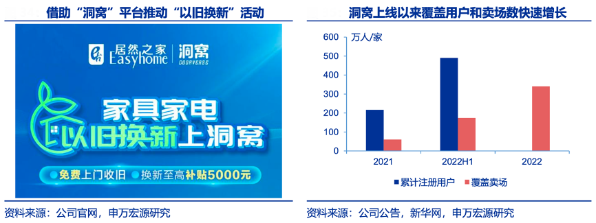經(jīng)典案例:根據(jù)公司官網(wǎng)、公司公告、新華網(wǎng)、申萬宏源研究等綜合資訊表明,居然之家公司借助洞窩平臺,在2022 年 5 月發(fā)布家具“以舊換新”活動,不僅大幅減少資源浪費,也可以幫助商戶挖掘和搶占零散的存量市場,把握未來二手房翻新、局部升級以及老舊小區(qū)改造等市場發(fā)展新機(jī)遇。
