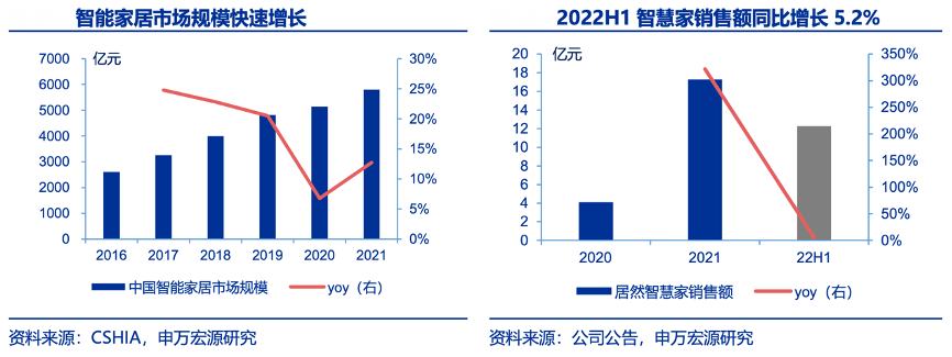經(jīng)典案例:根據(jù)CSHIA、公司公告、申萬宏源研究等綜合資訊表明,居然智慧家定位于智慧生活零售服務(wù)平臺,以數(shù)字化技術(shù)為核心驅(qū)動力,以蘋果、華為、小米等品牌手機(jī)和智能家居系統(tǒng)代理為依托,向消費者提供沉浸式智能生活體驗和美學(xué)生活展示。智慧家通過輕資產(chǎn)模式實現(xiàn)快速擴(kuò)張,截至 2022 年 6 月末已累計開業(yè)和簽約 66 家門店,2021 年智慧家銷售額 17.28 億元,同比 增長 321.7%,22H1 智慧家銷售額 12.29 億元,同比增長5.2%。