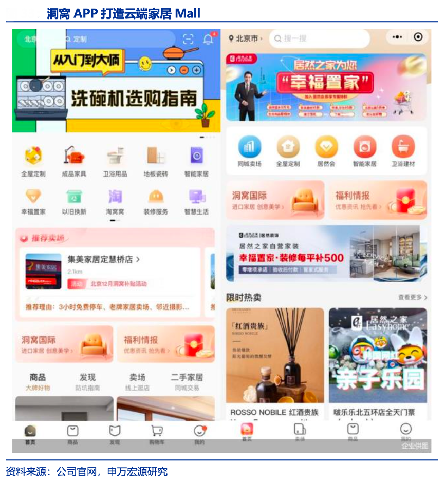 經典案例:根據公司官網、申萬宏源研究等綜合資訊表明,家裝家居數字化零售平臺“洞窩”改變過去線上和線下割裂的局面,打破產業上下游的“零和博弈”,形成“價值協同”。對于消費者,洞窩相當于消費者在本地云端的家居 Mall,平臺可自動匹配距離消費者最近的賣場,眾多家居品牌及產品以品類、營銷特色及用戶真實評價進行推薦,方便消費者快速找到心儀產品,提升消費者“在線選品、到店體驗、離店決策、到家服務”場景體驗。
