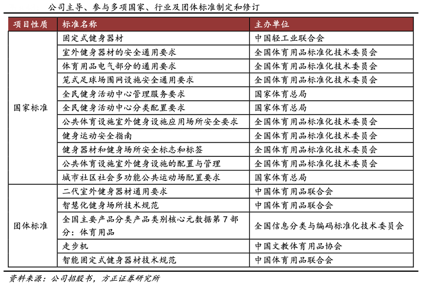 經典案例:根據公司招股書、方正證券研究所等綜合資訊表明,舒華針對不同區域人群的體格差異,研究大量數據資料并數次測試實驗,將成果應用到產品的研發設計中,使產品更加符合東方人體運動軌跡。公司作為健身器材國家標準起草單位之一,持續參與行業標準制定和修訂,并及時轉化內部標準,目前已主導、參與 30 余項國家、行業及團體標準的制定和修訂。