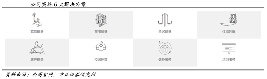 經典案例:根據公司官網、方正證券研究所等綜合資訊表明,舒華公司擁有齊全的產品線,涵蓋家用、商用、戶外、按摩、健身小件多個品類以及展示架產 品,相繼推出“舒華”、“柏康”等定位清晰的系列健身器材品牌, 針對 2B、2C 和 2G 三大領域分別布局家庭健身、商用健身、全民健身、 體能訓練、康養健身、校園體育六大產品線。