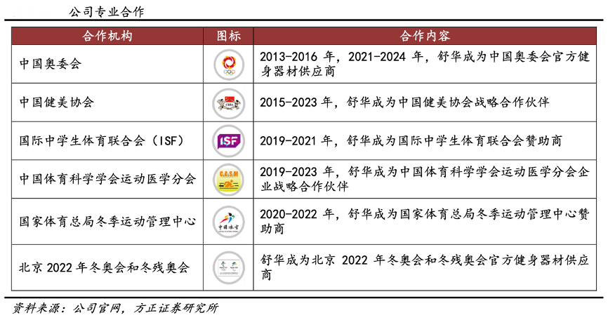 經典案例:根據公司官網、方正證券研究所等綜合資訊表明,舒華公司綁定專業運動賽事/協會,成為 2021-2024 年中國奧委會、北京 2022 年冬奧會和冬殘奧會官方健身器材供應商,贊助中國健美協會、國家體育總局冬季運動管理中心等專業協會。其通過和頂尖 IP/資源合作,強化自身專業運動形象,塑造品牌實力與信任感、建立品牌忠誠度。