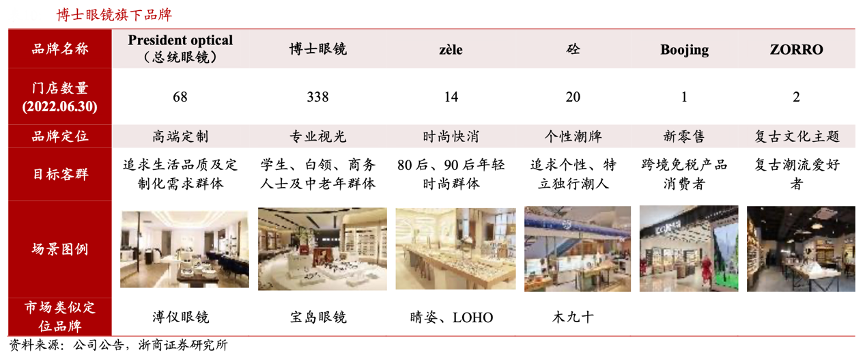 經(jīng)典案例:根據(jù)公司公告、浙商證券研究所等綜合資訊表明,博士眼鏡重點(diǎn)發(fā)力“專業(yè)+高端”核心品牌門店。公司緊跟消費(fèi)趨勢(shì)的變化,針對(duì)不同目標(biāo)客 群目前已建立起 6 大眼鏡零售品牌。公司旗下核心品牌“博士眼鏡”和“總統(tǒng)眼鏡”著眼于中高端消費(fèi)群體,截至 2022 上半年,公司已開設(shè) 338 家博士眼鏡品牌門店和 68 家總統(tǒng)眼鏡品牌門店,在門店總數(shù)中占比 83%。