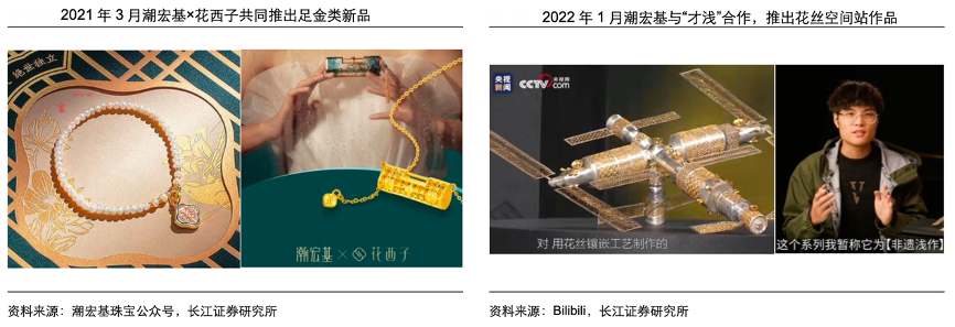 經(jīng)典案例:根據(jù)潮宏基珠寶公眾號(hào)、Bilibili、長(zhǎng)江證券研究所等綜合資訊表明,潮宏基2021 年 3 月,潮宏基聯(lián)合以中國(guó)傳統(tǒng)美學(xué)元素為核心的國(guó)貨美妝品牌花西子,共同推出并蒂同心足金手鏈、心之鎖向足金墜鏈等新品;2022 年 1 月,潮宏基聯(lián)合 Bilibili 上 擁有 484 萬(wàn)粉絲的手工界頂流 UP 主“才疏學(xué)淺的才淺”,利用花絲工藝打造了中國(guó)空間站模型,創(chuàng)作視頻播放量達(dá)到 504 萬(wàn),投幣量高達(dá) 110 萬(wàn),成為 B 站上少見(jiàn)的“幣比贊 多”的視頻作品(意味著觀眾看完視頻甚至產(chǎn)生了“付費(fèi)”意愿,體現(xiàn)強(qiáng)烈的認(rèn)可和贊賞)。
