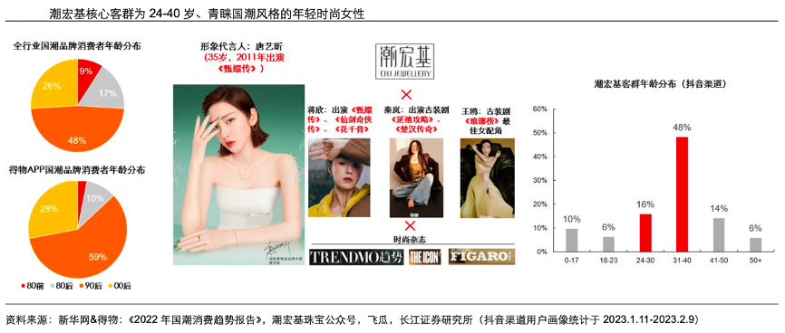 經(jīng)典案例:根據(jù)新華網(wǎng)&得物:《2022年國(guó)潮消費(fèi)趨勢(shì)報(bào)告》、潮宏基珠寶公眾號(hào)、飛瓜、長(zhǎng)江證券研究所等綜合資訊表明,潮宏基全行業(yè)國(guó)潮品牌消費(fèi)者中,90 后和 00 后已占 74%;潮流網(wǎng)購(gòu)社區(qū)得物 APP 上的國(guó)潮品牌消費(fèi)者中 90 后群體占比高達(dá) 87%,與潮宏基的年輕時(shí)尚都市女性的核心客群的年齡 段較為重疊。在此基礎(chǔ)上,潮宏基于 2021 年 6 月官宣《甄嬛傳》的主演唐藝昕為品牌代言人,并邀請(qǐng)《延禧攻略》、《瑯琊榜》等熱門古裝劇的主演蔣欣、秦嵐、王鷗佩戴潮 宏基國(guó)潮系列珠寶,登上時(shí)尚雜志,提升其對(duì)于國(guó)潮系列產(chǎn)品的接受度。