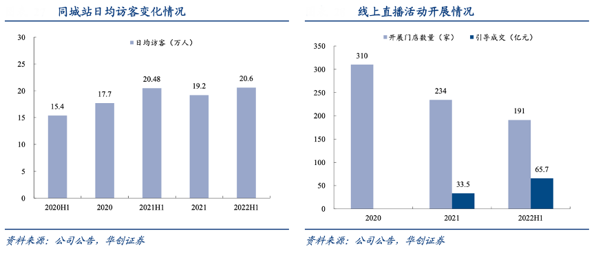 經典案例:根據公司公告、華創證券等綜合資訊表明,依托由阿里賦能的線上平臺及線下門店數字化能力, 居然之家可以利用淘寶直播平臺進行線上營銷,實現線下門店流量增長及引導成交。 2019-2021 年,同城站引導成交額從 12.2 億元大幅提升至 133 億元。2022 年上半年,同城站業務覆蓋全國 130 個城市,日均訪客達 20.6 萬人次,同比增長 5%;線上獲客 75.8 萬人,同比增長 138%;引導到店銷售 65.7 億元,同比增長 38%;“老汪來了”直播 當天店鋪 UV 突破 210 萬。