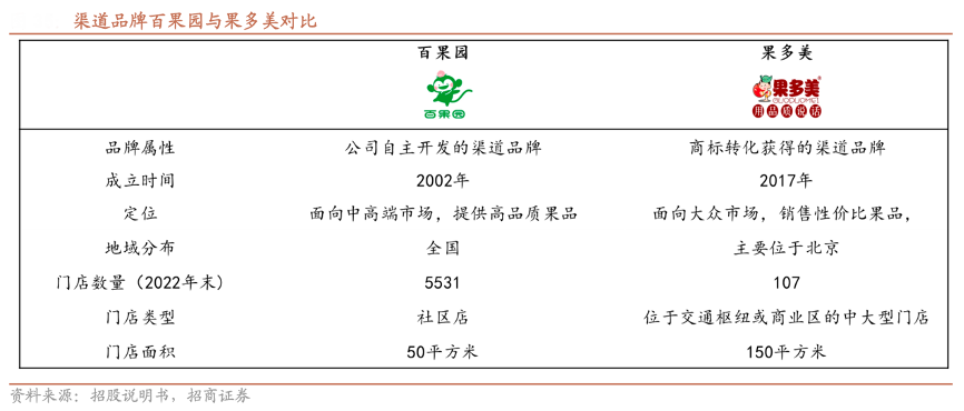 經典案例:根據招股說明書、招商證券等綜合資訊表明,百果園是公司自主開發的專有渠道品牌,定位于全國性品牌,主要面向中高端市場經營高品質果品。“百果園”作為公司核心品牌,其門店數占據絕對主體,截至 2022 年 12 月末百果園品牌下共有 5521 家加盟門店和 10 家自營門店,占總門店數量的 98%;基于品牌定位,百果園門店多為面積約 50 平米的社區店。