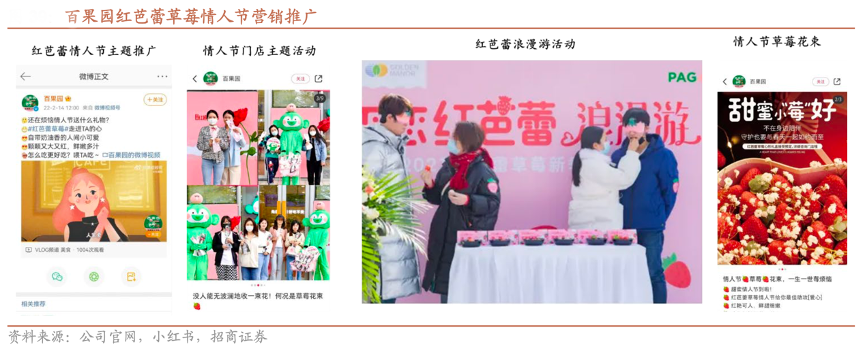 經典案例:根據公司官網、小紅書、招商證券等綜合資訊表明,百果園品牌通過微信公眾號、抖音短視頻、短信訂閱、門店展示燈箱等渠道進行水果知識和文化的傳播,旨在增強消費者對鮮果行業本身以及對百果園的品牌認知度。此外,公司在 2019 年對百果園品牌視覺形象進行升級后,陸續推出品牌 IP 周邊新品、開展創作營銷主題設計活動等,例如打造 “情人節紅芭蕾”話題及主題活動,相關短視頻點擊率突破 500 萬、微信話題閱讀量超過1700 萬,促進紅芭蕾草莓品牌 IP 化。