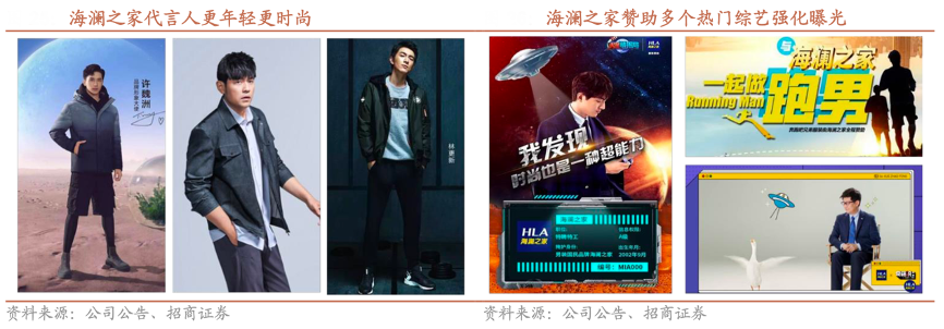 經典案例:根據公司公告、招商證券等綜合資訊表明,海瀾之家公司持續加大營銷投入,并隨著消費習慣變化,通過明星代言、流量投放、創新營銷等方式持續推進品牌年輕化轉型,廣告風格也更加簡約時尚。2017 年以來簽約周杰倫、林更新、許魏洲等國民及流量明星,并贊助熱門綜藝強化品牌曝光和知名度。