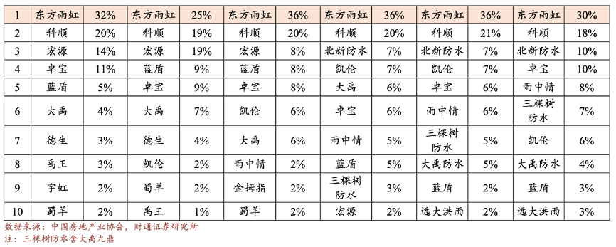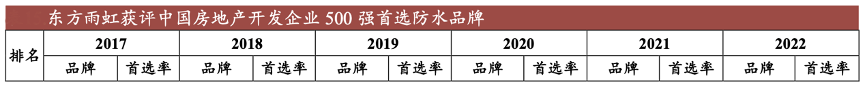 經典案例:根據中國房地產業協會、財通證券研究所等綜合資訊表明,2006 年 6 月,“雨虹牌”商標被國家工商行政管理總局認定為“中國馳名商標”, 是我國建筑防水材料行業第一個“中國馳名商標”。2016 年起,東方雨虹便登上中 國房地產開發企業 500 強首選防水品牌的寶座,并持續守擂。