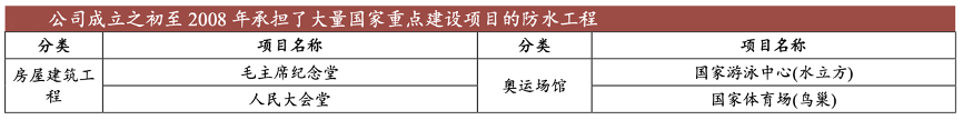 經典案例:根據公司招股說明書、財通證券研究所等綜合資訊表明,東方雨虹公司成立以來承擔了大量的國家重點建設項目和更新改造項目的防水工程,比如毛主席紀念堂、奧林匹克運動村、鳥巢等,基建工程端的滲透使得公司品牌知名度逐步提升。