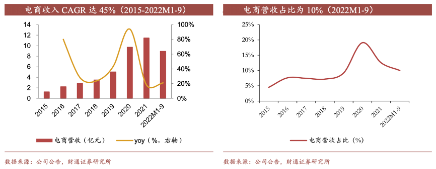 經(jīng)典案例:根據(jù)公司公告、財通證券研究所等綜合資訊表明,周大生公司電商業(yè)務保持增長態(tài)勢,2015-2021年CAGR 高達 45%。2022 年前三季度,公司電商業(yè)務實現(xiàn)營業(yè)收入 8.94 億元,同比增長 20.97%, 營收占比10%。在省代模式推動線下門店擴張大背景下,線上收入占比仍顯著高于疫情前水平。