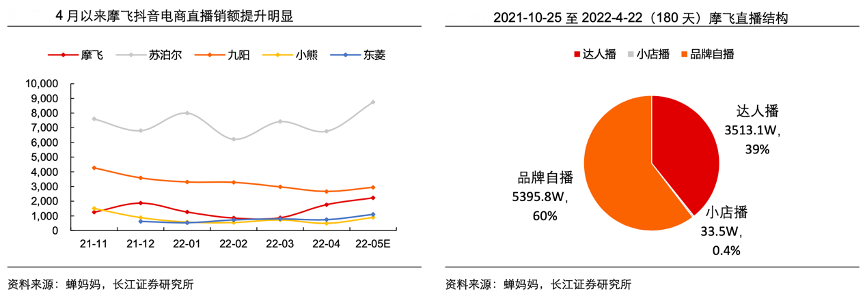 經典案例:根據蟬媽媽、長江證券研究所等綜合資訊表明,2021 年下半年以來,摩飛加大對抖音渠道的發展,直播規模處于小家電行業前列; 結構上看,摩飛的品牌自播及達播形式共存。抖音經銷商矩陣也逐步豐富,既有傳統經 銷商的積極開店,頭部直播間即由擅長內容營銷和創作的老牌經銷商參與;也有新的經 銷商開設中式廚電旗艦店、摩飛生活館,盡管開播時間分別為 2022 年 1 月 15 日和 2022 年 4 月 15 日,但在短時間內也實現對頭部抖音店的月銷量和粉絲增量的追趕。