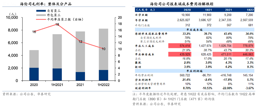 經典案例:根據公司公告、華泰研究等綜合資訊表明,海倫司公司通過產品結構優化、精細化運營,壓降門店盈虧平衡點,提振盈利能力。從行業層面來看,小酒館門店層面盈虧平衡點為 60%,優于大部分餐飲業態。公司加大智能化投入,優化單店人員數量,提升人效,1H22 平均單店人數(10 人/店)較 1H21(18 人/店)減少近43.5%,1H22 平均單店人力成本同比下降 45%(剔除股權激勵),22 年 6 月整體店均保本點較 2019 年和 2021 年下降約 25%。