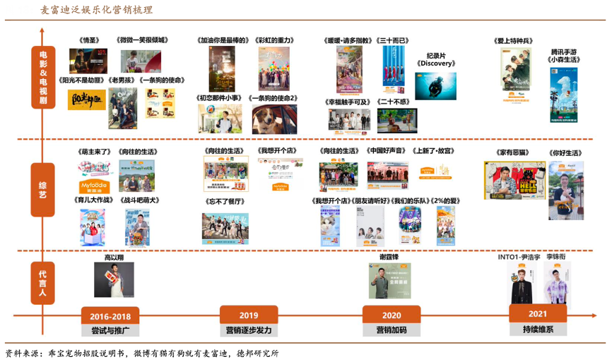經典案例:根據乖寶寵物招股說明書、微博有貓有狗就有麥富迪、德邦研究所等綜合資訊表明,乖寶公司主要通過簽約代言人、綜 藝/影視植入、內容推廣等方式增加境內自有品牌曝光度。代言人簽約歌手、演員謝霆鋒、男子演唱組合 INTO1 成員尹浩宇和韓國搖滾樂隊 RoyalPirates 成員李銖銜作為公司形象代言人,而綜藝影視:在《你好生活》、《向往的生活》、《中國好聲 音》、《三十而已》等熱門綜藝影視上進行廣告植入。