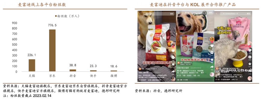 經典案例:根據天貓麥富迪旗艦店、京東麥富迪京東自營旗艦店、抖音麥富迪官方旗艦店、快手麥富迪官方旗艦店、微博有貓有狗就有麥富迪、抖音、德邦研究所等綜合資訊表明,截至 2023 年 2 月 14 日乖寶公司在天貓、京東、抖音、快手平臺旗艦店粉絲數分別為 226.1 萬、776.5 萬、38.8 萬和 23.3 萬。另外公司積極推進 KOL 孵化項目,通過與 Bilibili、小紅書、抖音、快手等平臺 KOL 的內容合作,培育品 牌 KOL 矩陣,以日常廣告和新品種草的形式推廣產品。