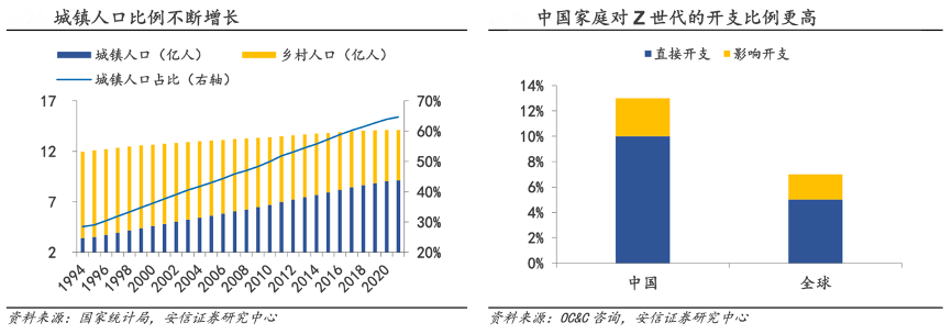 經典案例:根據國家統計局、OC&C咨詢、安信證券研究中心等綜合資訊表明,Z 世代所代表的 1995-2009 年 是我國經濟騰飛及人民生活水平大幅提升的主要階段,其在城鎮出生長大的比例高,家庭環境總體而言較為殷實,家庭支出中更愿意為在 Z 世代上消費。根據 OC&C 的咨詢報告,中國家庭 13%的開支投入在了 Z 世代,高于全球 7%的平均水平。