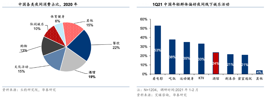 經典案例:根據頭豹研究院、艾媒咨詢、華泰研究等綜合資訊表明,2020年酒館業態占夜間消費規模的 19.3%,據艾媒咨詢,小酒館是年輕消費群體偏好的 TOP5 娛樂活動,調查中選擇在夜間去酒吧/小酒館的青年群體達到了 23.5%。立足長期,以 Z 世代為代表的年輕一代而言,社交、娛樂已上升為剛需,伴隨這代際人群對消費貢獻比重的不斷攀升,需求釋放或進一步助力小酒館市場規模擴大。
