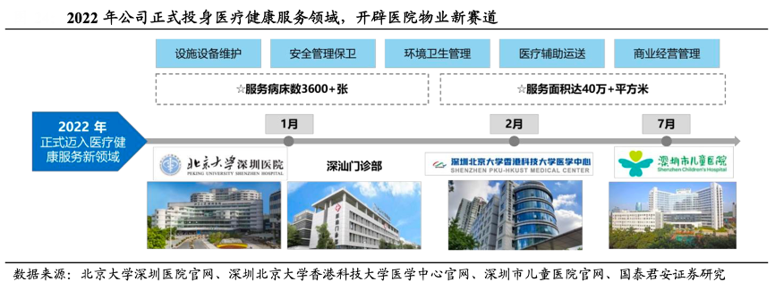 經(jīng)典案例:根據(jù)北京大學(xué)深圳醫(yī)院官網(wǎng)、深圳北京大學(xué)香港科技大學(xué)醫(yī)學(xué)中心官網(wǎng)、深圳市兒童醫(yī)院官網(wǎng)、國泰君安證券研究等綜合資訊表明,2022年特發(fā)服務(wù)公司通過市場化方式拓展醫(yī)院物業(yè),正式邁入醫(yī)療健康服務(wù)新領(lǐng)域,屬于截至 11 月已獲 4 大深圳醫(yī)院項目。公司目前已獲北京大學(xué)深圳醫(yī)院、深汕門診部、深圳北京大學(xué)香港科技大學(xué)醫(yī)學(xué)中心和深圳市兒 童醫(yī)院四大項目,服務(wù)病床超過 3600 張,合計服務(wù)面積超過 40 萬方。