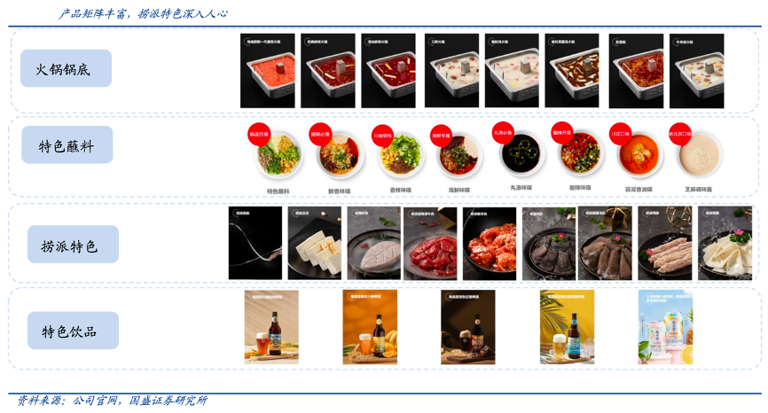 經典案例:根據公司官網、國盛證券研究所等綜合資訊表明,海底撈是火鍋賽道領軍者,立足國內走向全球。其創立于 1994 年四川簡陽,歷 經近 30 年發展,已經成為全國乃至全球中式餐飲知名品牌。10 年時間公司從 2010 年 “中國餐飲企業百強”第 20 名躍升為 2020 年的第 2 名,超越麥當勞,居于百勝中國之下。同時,極致服務一直是海底撈的品牌標簽,細致入微、賓至如歸的貼心服務提高了海底撈的知名度,如特色撈面表演,川劇變臉表演、美甲護手服務等。產品矩陣豐富,火鍋店不斷創新鍋底、調料、小吃、飲品等。