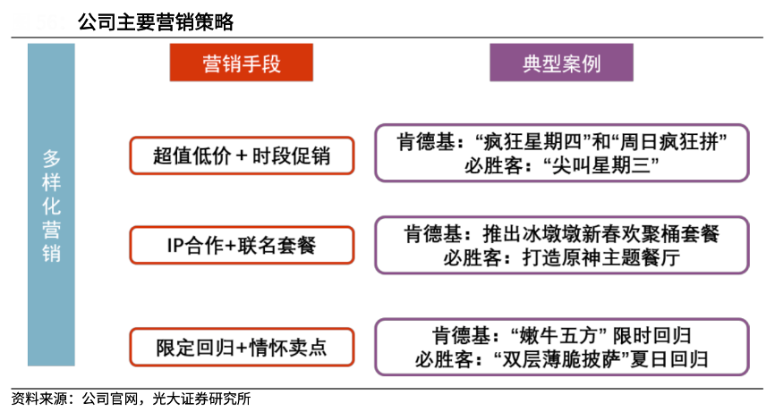 經典案例:根據(jù)公司官網(wǎng)、光大證券研究所等綜合資訊表明,百勝中國公司以“超值促銷+IP 聯(lián)名”掌握流量密碼,“限時回歸”主打情懷營銷。其除了邀請明星廣告代言增加品牌曝光度外,公司也精心策劃出多個“出圈”的營銷活動,不斷強化品牌賣點。從火遍全網(wǎng)的“瘋狂星期四”段子,到必勝客原神主題餐廳,再到限時回歸經典產品“嫩牛五方”,公司利用低價促銷、 IP 聯(lián)名和限定回歸等多樣手段進行品牌營銷,打造品牌記憶點。