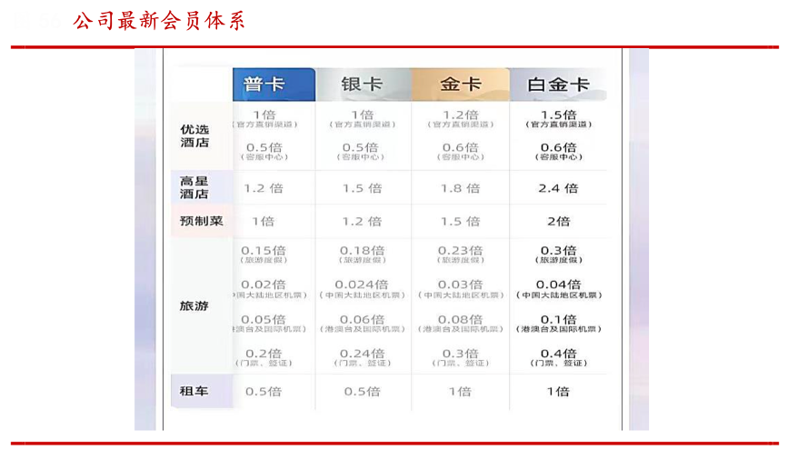 經(jīng)典案例:根據(jù)華西證券研究所等綜合資訊表明,2023 年 5 月,錦江酒店公司正式推出錦江會(huì)員全新升級(jí)計(jì)劃,消費(fèi)者若擁有中國區(qū)多個(gè)品牌的會(huì)員,則可以按照就高匹配原則僅保留一個(gè)錦江會(huì)員身份,分為普卡、銀卡、金卡、白金卡四擋,且將集團(tuán)的餐飲、租車、旅游等板塊也納入積分兌換體系,大會(huì)員戰(zhàn)略再進(jìn)一步。