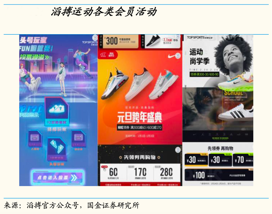 經典案例:根據滔搏官方公眾號、國金證券研究所等綜合資訊表明,滔搏建立了一套規模化會員體系,通過電商+微信社群+小程序+直播+App+公眾號矩陣形成全方位離店場景,完成線上線下一體化的流量沉淀和轉化。滔搏會員體系為消費者提供會員權益、線上購物、優質內容相結合的服務和體驗,大大提升了會員的互動。