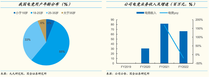 經典案例:根據九九研究院、公司公告、國金證券研究所等綜合資訊表明,電競用戶中 66%為男性,35 歲及以下用戶占比高達 94%,而電競項目具有部分競技體育的屬性,因此與公司的核心客戶群體高度重合。2017 年 12 月公司正式進軍電競領域,組建滔搏電子競技俱樂部(TES),FY22 年公司電競業務實現收入 0.66 億元。