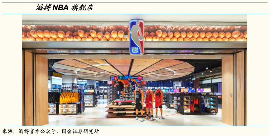經典案例:根據滔搏官方公眾號、國金證券研究所等綜合資訊表明,2019 年公司成為 NBA 中國旗艦店獨家運營合作伙伴,并陸續在北京、廣州、天津開設旗艦店,其中 2021 年 12 月開業的天津旗艦店面積達 1500 平米,門店有特別為中國球迷打造的貨品組合,多款只在球隊主場球迷商店才能買到的特許經營產品,并精心還原籃球賽場、球衣更衣室等場景,為中國球迷營造濃郁的 NBA 文化氛圍。