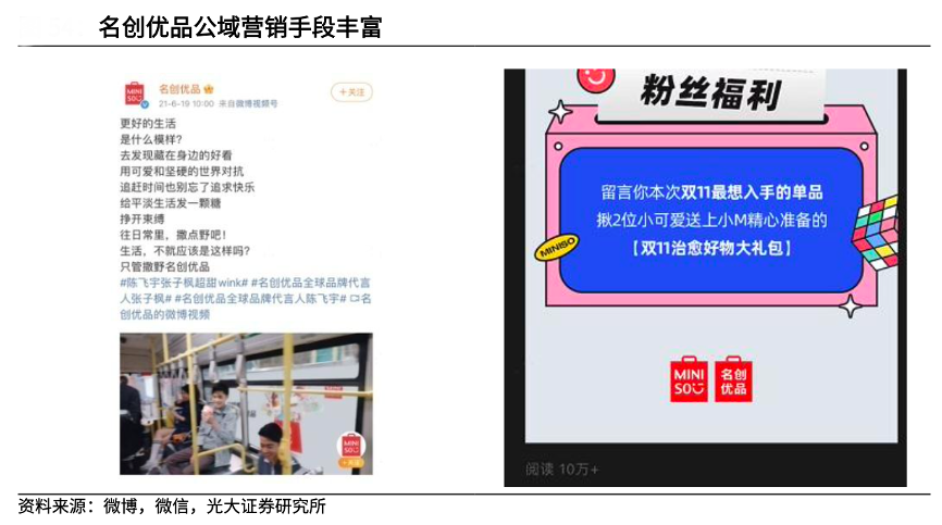 經(jīng)典案例:根據(jù)微博、微信、光大證券研究所等綜合資訊表明,在公域上,名創(chuàng)優(yōu)品通過品牌代言人、宣傳視頻等多種方式進行營銷,提高品牌知名度。例如,名創(chuàng)優(yōu)品的官方微博通過日常運營、代言視頻宣發(fā)以及網(wǎng)友互動等方式,截至 2022 年 11 月 25 日,積累超過 380 萬粉絲。