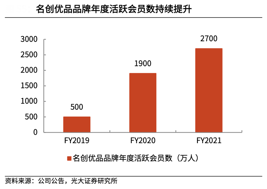 經(jīng)典案例:根據(jù)公司公告、光大證券研究所等綜合資訊表明,在私域運營上,名創(chuàng)優(yōu)品借助會員計劃與門店消費者社群來維持對顧客的持續(xù)互動。對于名創(chuàng)優(yōu)品品牌,其會員計劃于 2018 年 8 月推出,截至 FY2021 底,名創(chuàng)優(yōu)品品牌的年度活躍會員數(shù)(在過去一年中有過消費記錄的會員)達到 2700 萬人。